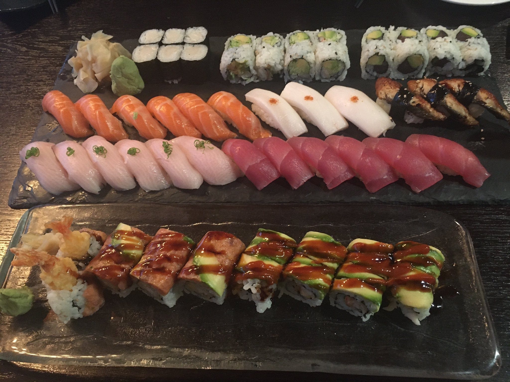 Sushi isn’t necessarily raw fish (cooked fish is also used), or even fish at all (vegetarian sushi is a thing, as is sushi involving other types of meat2). Nor is raw fish, even when properly prepared and served as a meal, necessarily sushi; a slice of raw fish by itself is sashimi, not sushi. (Good sashimi is amazing, but for me at least it doesn’t quite cross into the rarefied precincts of the transcendent.)